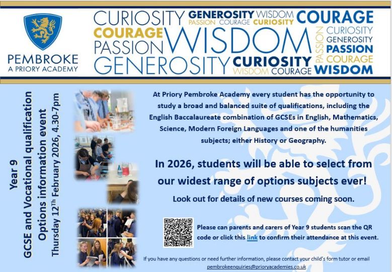 Options are a vital set of decisions in a young person’s academic life. Even though some of the curriculum at Key Stage 4 is prescribed, this is the first time that young people will have any degree of choice in which subjects they can study. When considering the information within the options booklet, we encourage students to think about their next steps after GCSE. Further Education providers and employers want to see students who have good qualifications in a range of subject areas. As a consequence, considerable time and thought should be applied to choosing wisely. Miss Smith and Mx Sadler, Pembroke Academy’s Careers Coordinators, will be on hand to offer help and support throughout the process, and a full programme of support will be delivered in Personal Development sessions to ensure students are as prepared as possible before making their final decisions.. There will also be an opportunity to discuss the courses your child is interested in and ask any questions you may have during the Parents' Evening and Options Evening on Thursday 12th February 2026.